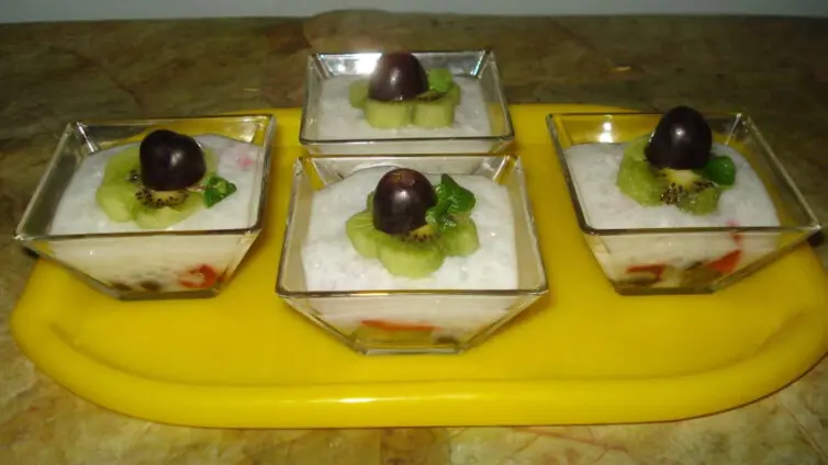 In your individual serving bowls, place a generous layer of chopped seasonal fruits at the bottom. Pour the cooled coconut-sago pudding over the fruit.