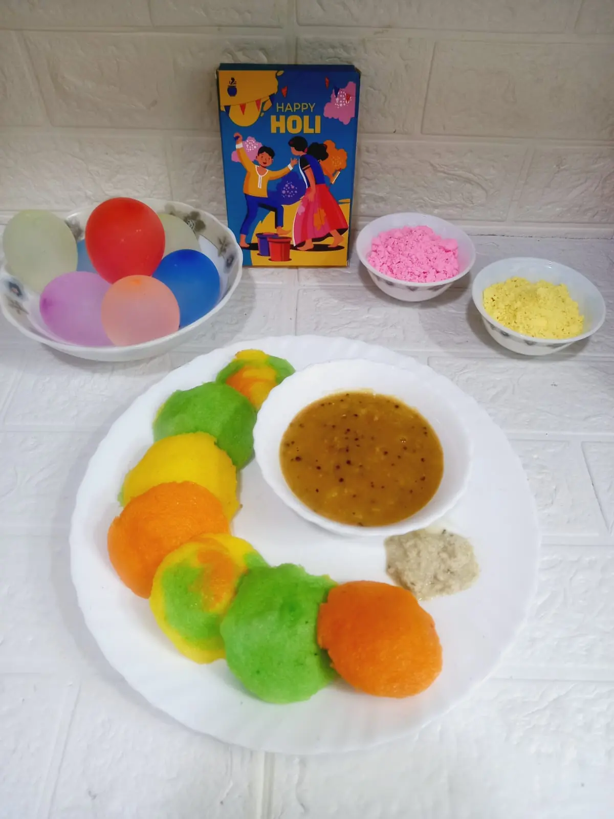 Grease the idli moulds lightly and pour each coloured batter into separate cavities.