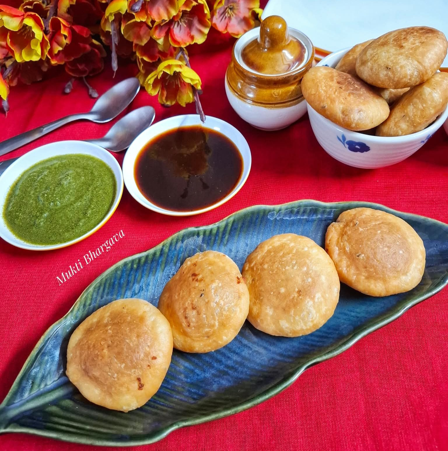 Serve with coriander mint chutney and date tamarind chutney.