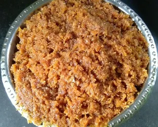 Heat ghee in a pan, add grated coconut and jaggery. Cook until the mixture becomes dry and aromatic. Let it cool.