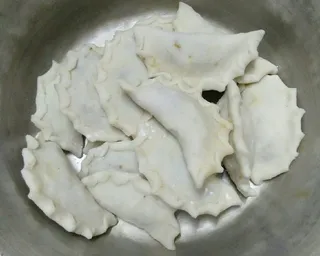 Take small portions of the dough, flatten, add coconut filling, and shape into puli.