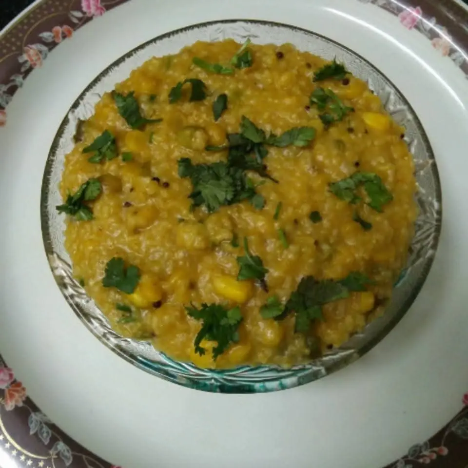 Add peas and corn fry for a min. Add dalia and mix well.