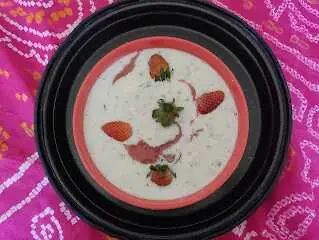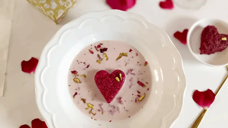Plating: Pour strawberry rabadi into a serving plate/bowl. Gently place the beetroot kalakand heart in the center.