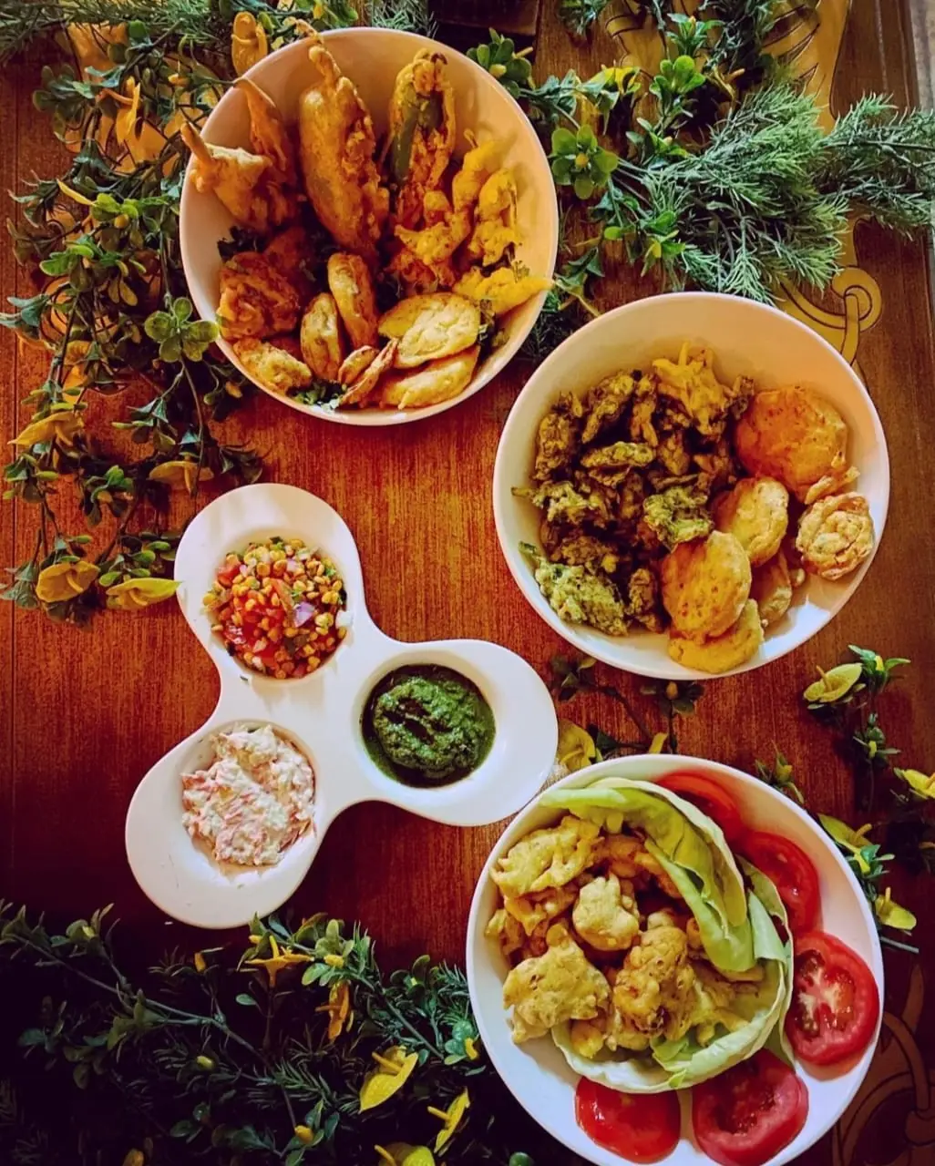 Assemble the Festive Platter (5 minutes): Arrange hot pakoras in separate bowls or sections on a large platter for that colorful mela vibe.