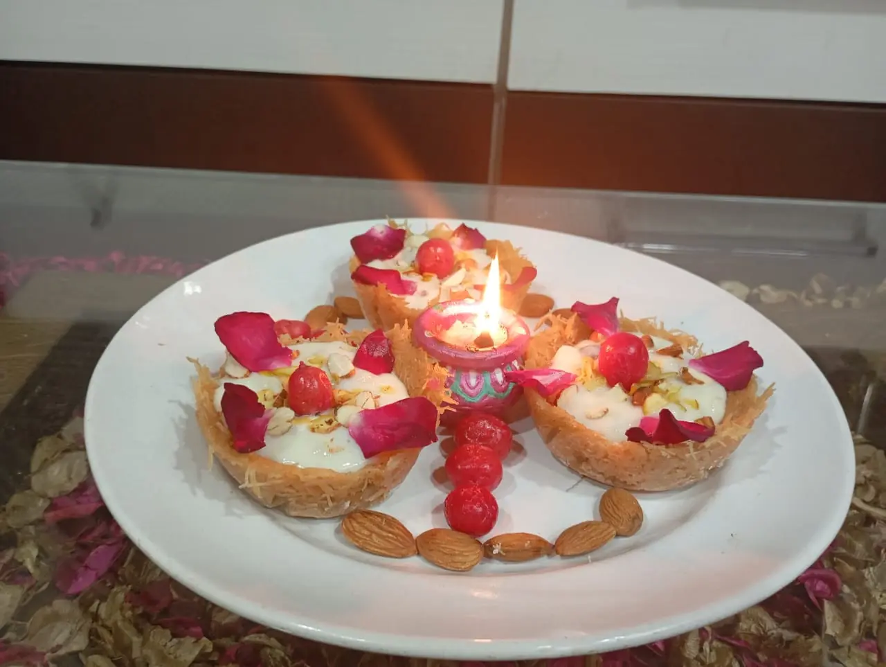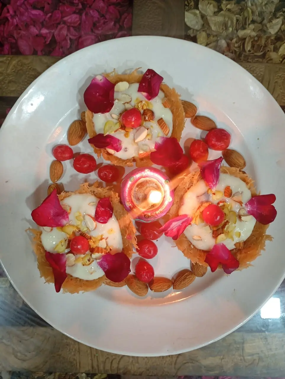 Then add custard powder in one cup of cool milk and then add in the boiling milk. Keep constantly staring it till become thick and at last add Dryfruits. For assembly first take katori then add rubri and garnish with Dryfruit, cherry and rose petals…